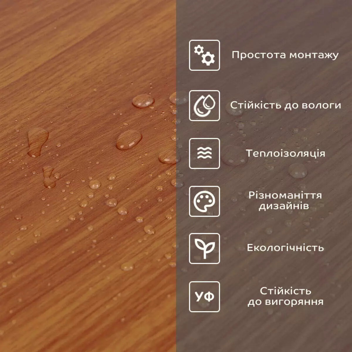 Фактура: рівна, з імітацією натуральних матеріалів. Поверхня глянсова або матова.