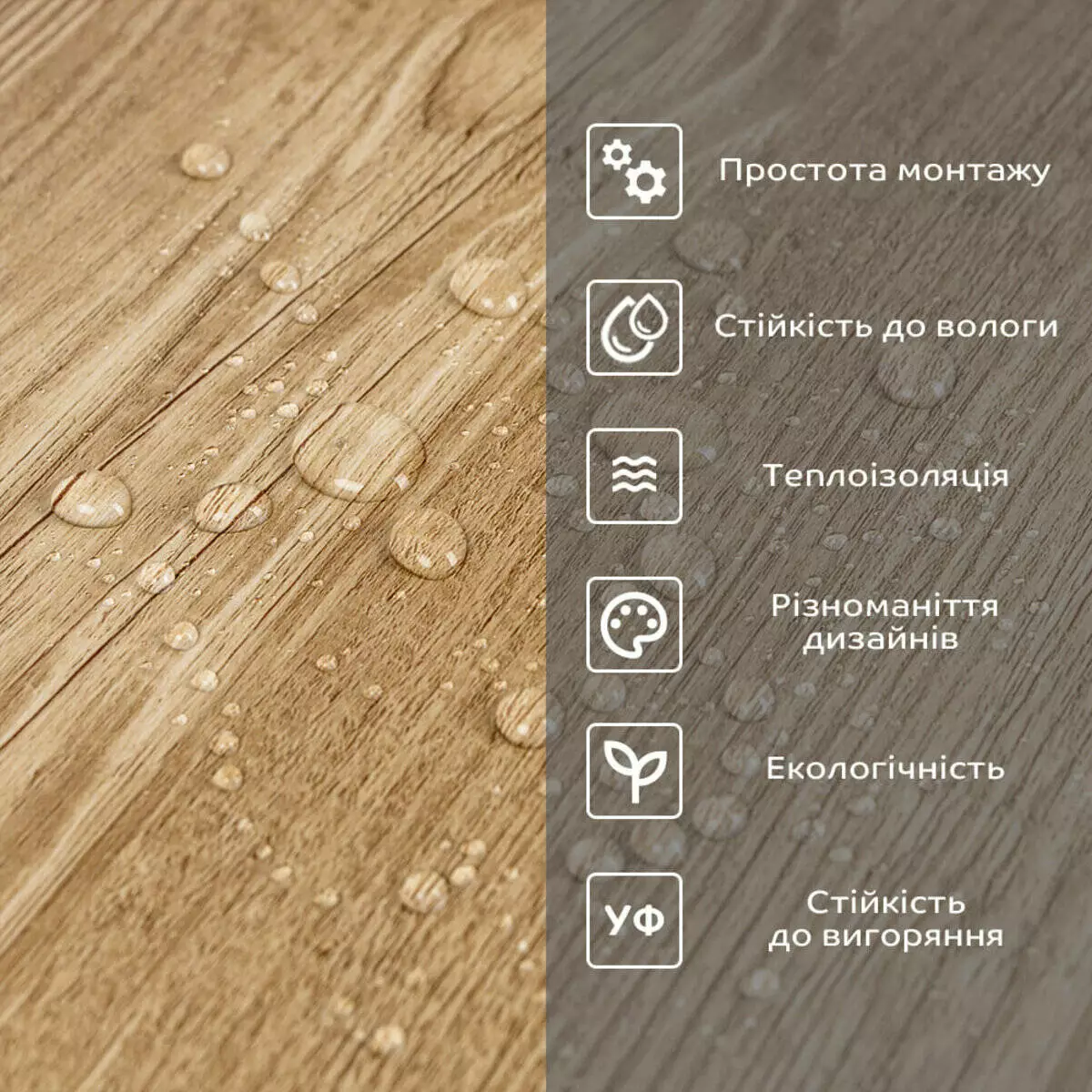 Фактура: рівна, з імітацією натуральних матеріалів. Поверхня глянсова або матова.