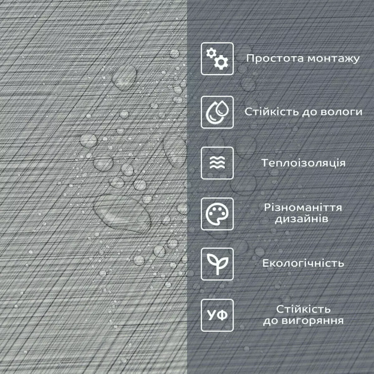 Фактура: рівна, з імітацією натуральних матеріалів. Поверхня глянсова або матова.