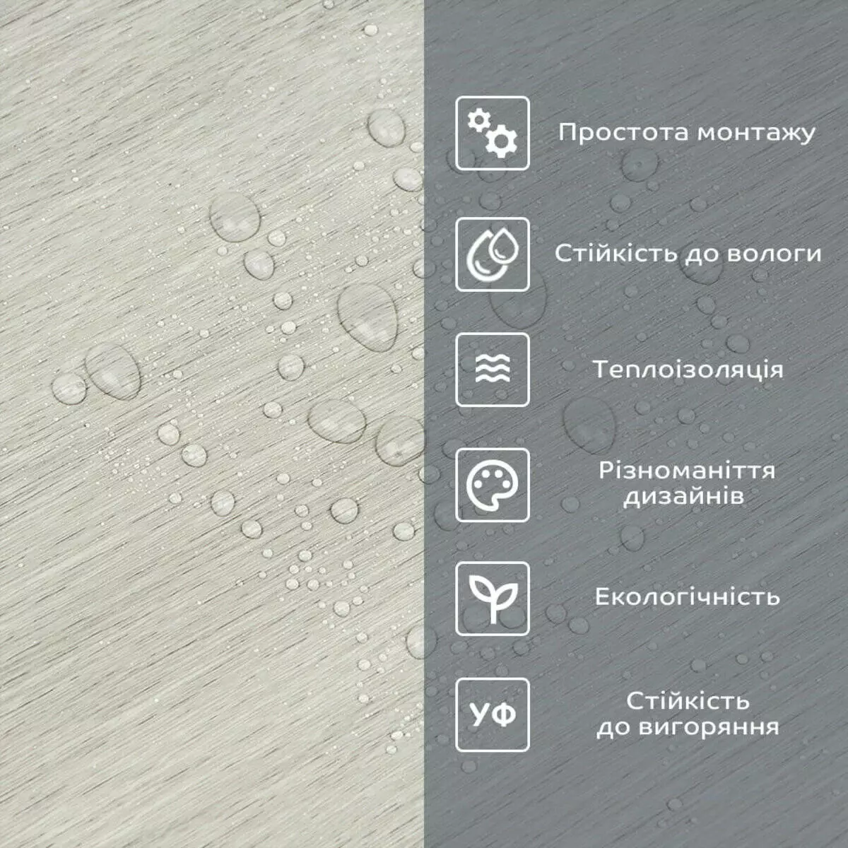 Фактура: рівна, з імітацією натуральних матеріалів. Поверхня глянсова або матова.