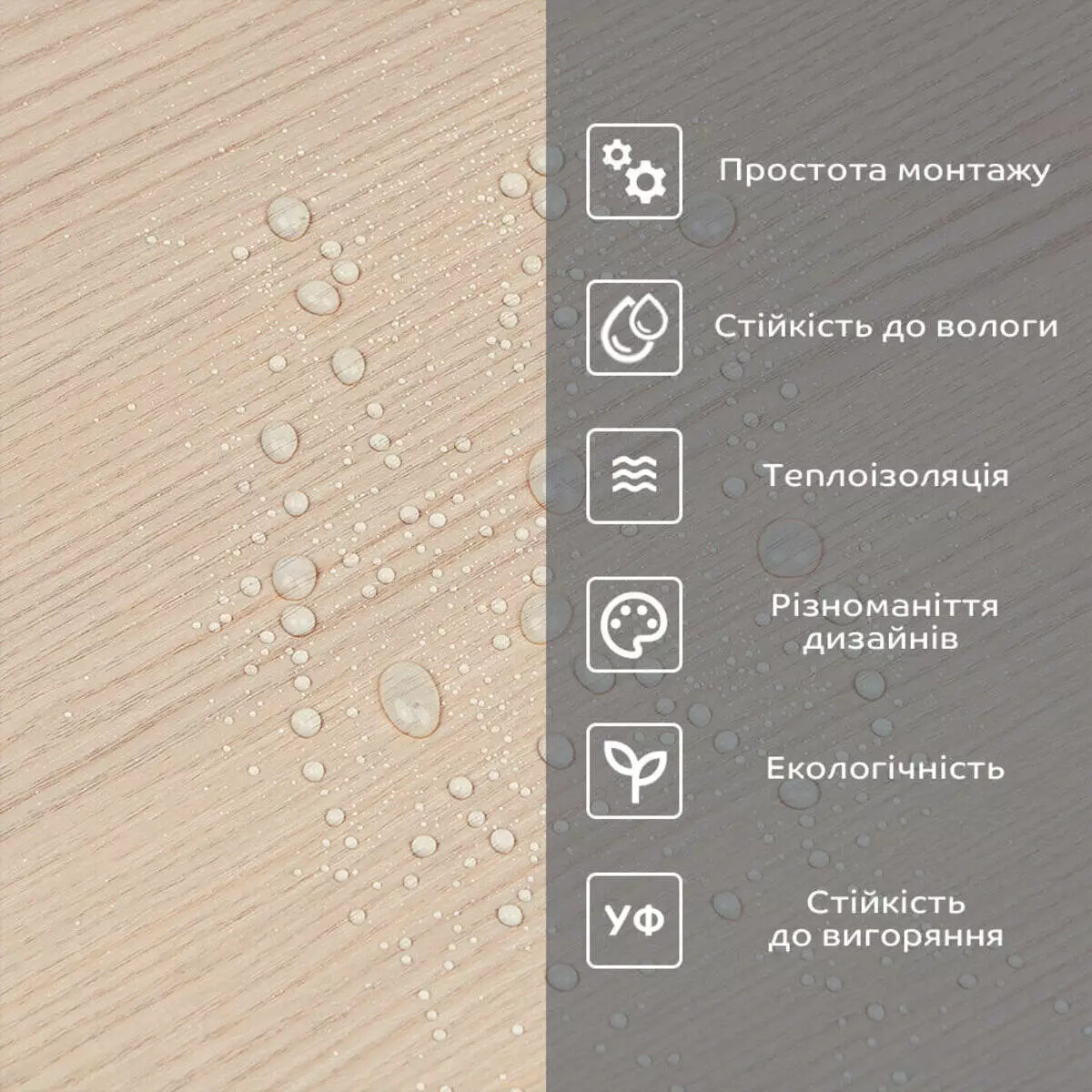 Фактура: рівна, з імітацією натуральних матеріалів. Поверхня глянсова або матова.