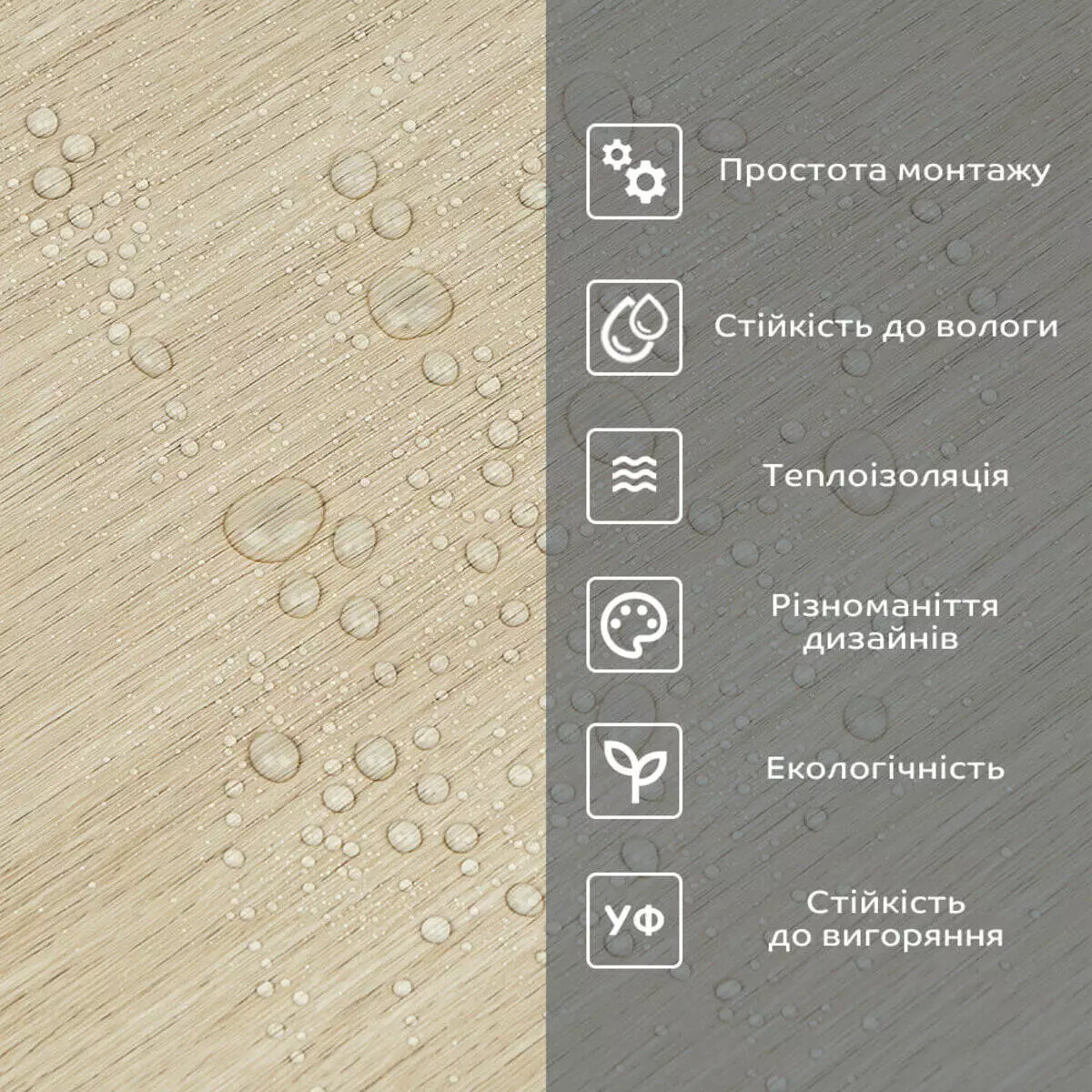 Фактура: рівна, з імітацією натуральних матеріалів. Поверхня глянсова або матова.