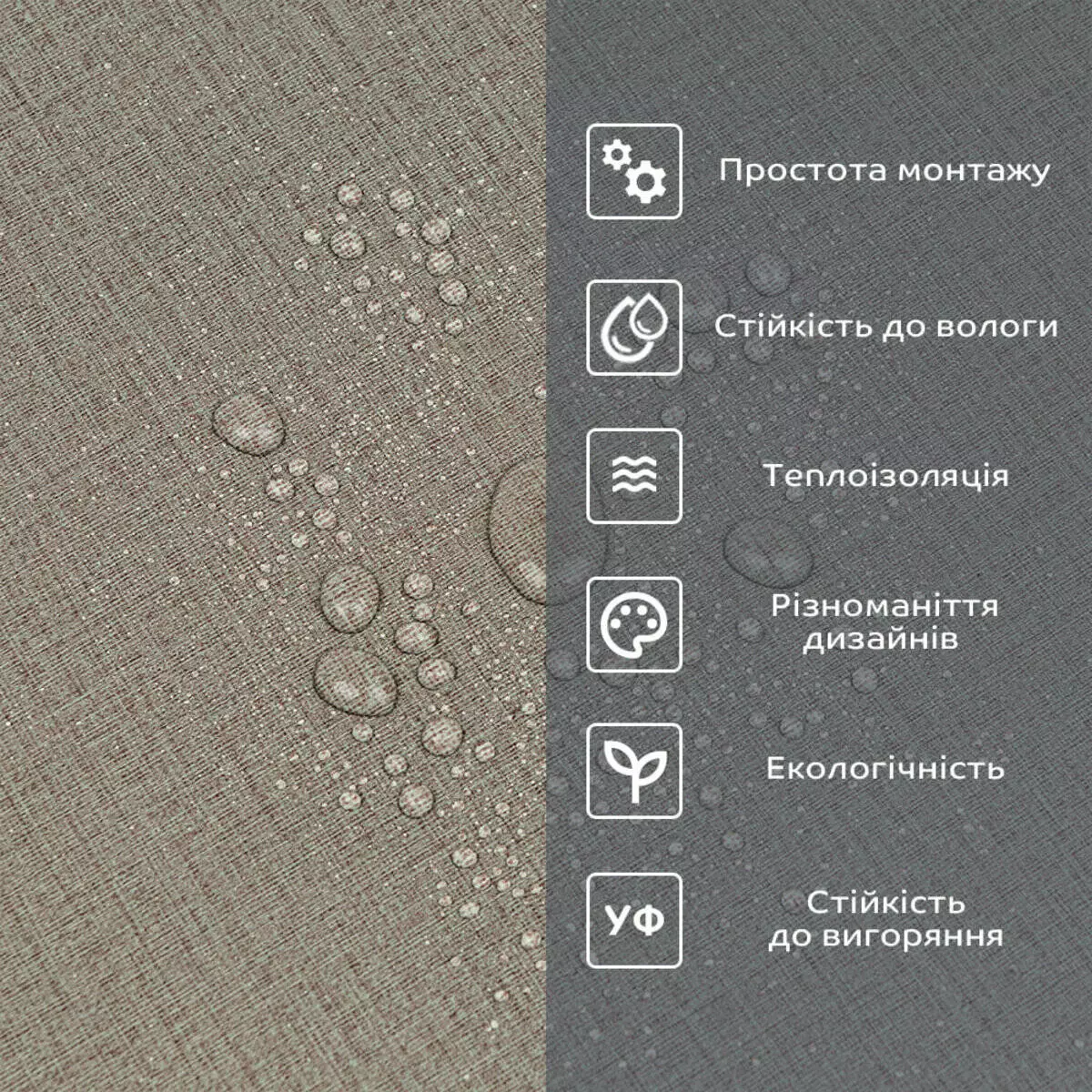 Фактура: рівна, з імітацією натуральних матеріалів. Поверхня глянсова або матова.