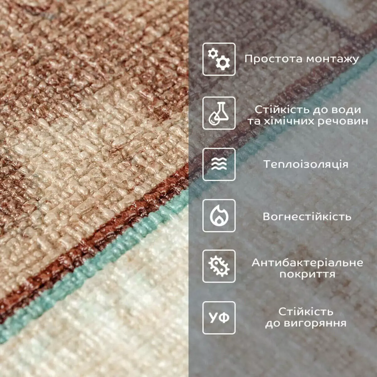 - Прінтована полімерна плівка - має антибактеріальні властивості, стійкість до вологи, хімічних речовин і температури. -захист допомагає запобігти вигоранню, зберігаючи колір насиченим, за рахунок чого шпалери довго зберігають свій первісний естетичний вигляд