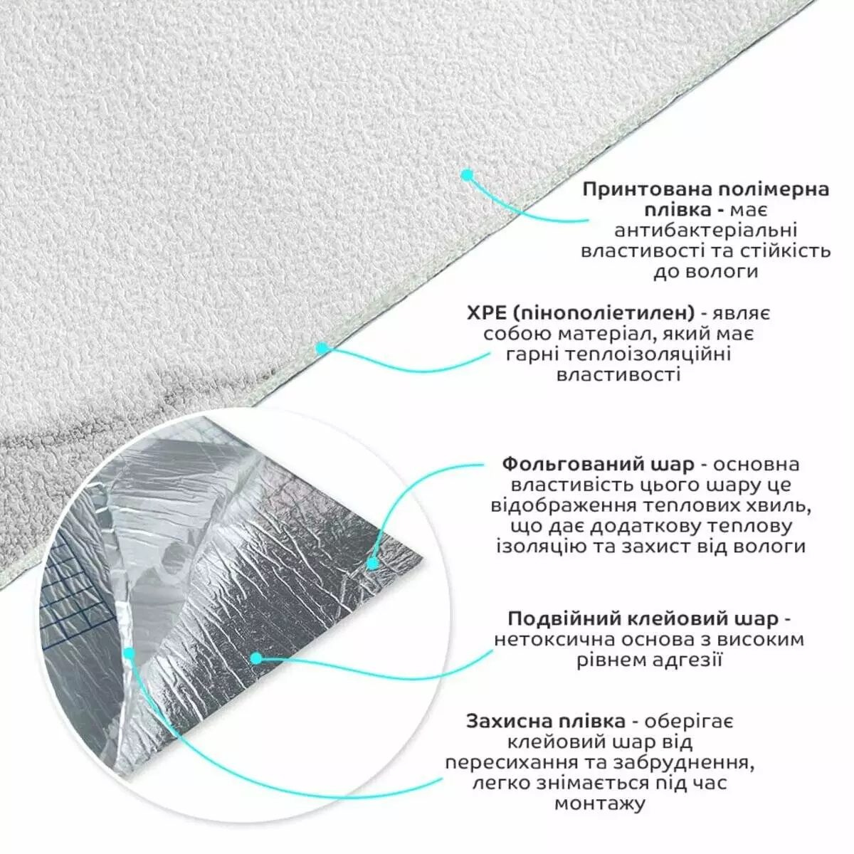 - Теплоізоляція: Спінений ХРЕ і фольгований шар забезпечують хорошу теплоізоляцію, що допомагає підтримувати комфортну температуру в приміщенні.