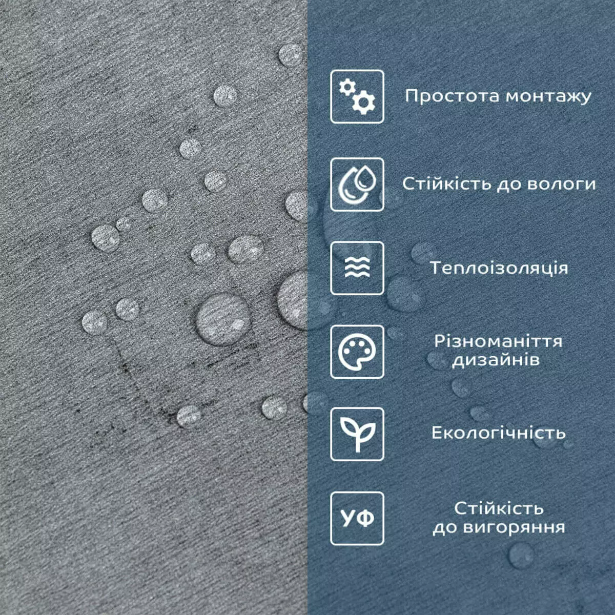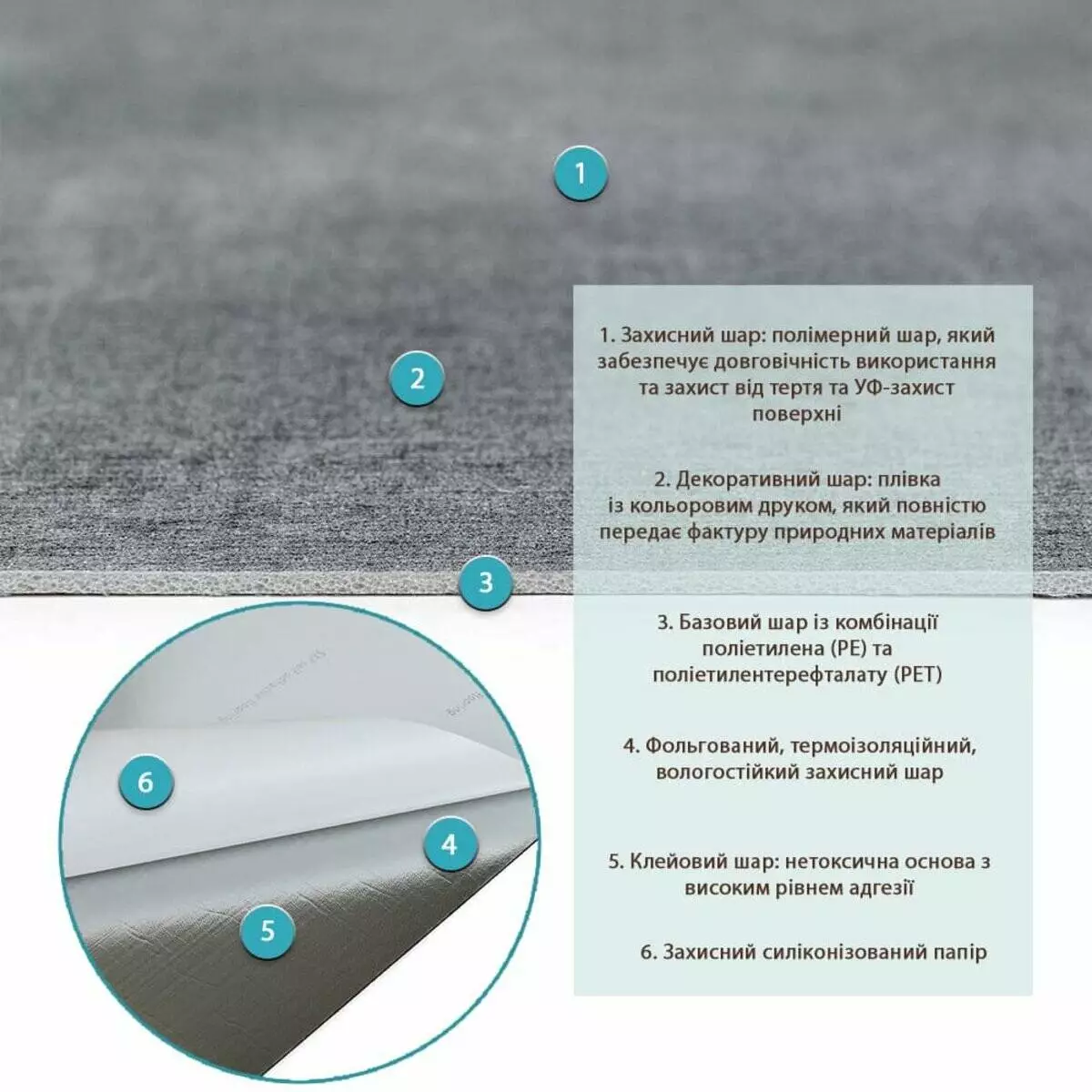 - Полімерний шар: захищає від потертостей та дрібних механічних пошкоджень, забезпечує довговічність використання, а УФ захист допомагає запобігти вигоранню, зберігаючи колір насиченим.