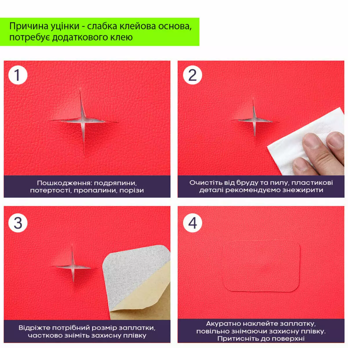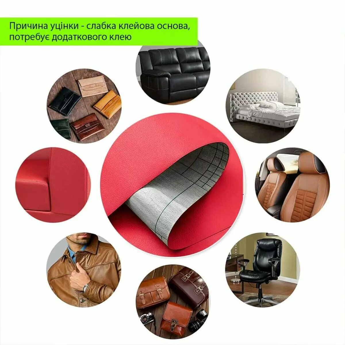 Призначення: ремонтно-оздоблювальні роботи та декорування. Матеріал може використовуватися у різноманітному ремонті дверей, м’яких меблів та стільців, деталей салонів автівок, сидінь велосипедів та мотоциклів, а також для реставрації шкіряно-галантерейної продукції та одягу.