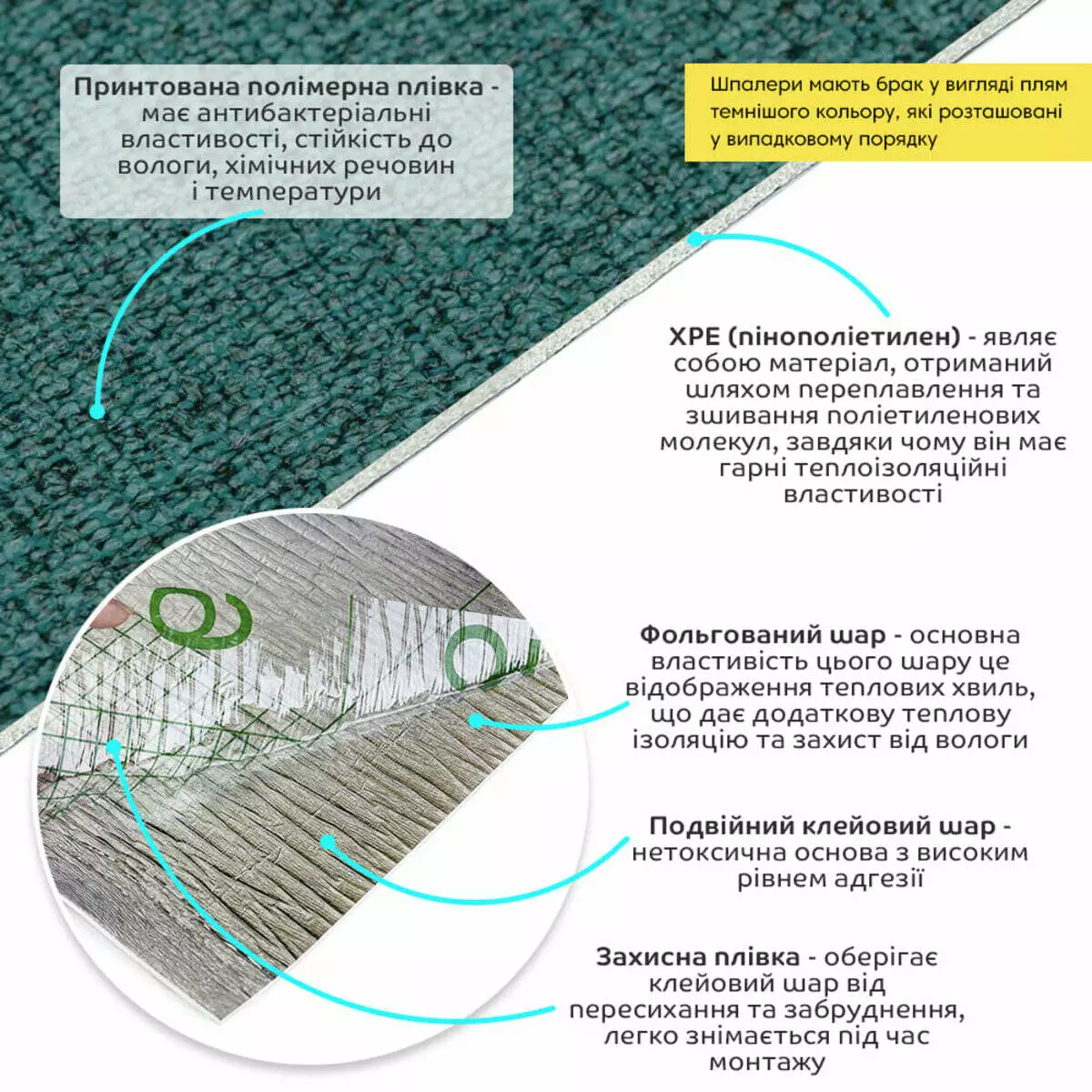 - Фольгований шар: основна властивість цього шару – відображення теплових хвиль, що дає додаткову теплову ізоляцію та захист від вологи, роблячи шпалери більш стійкими до впливу вологи та придатними для використання у кухнях.