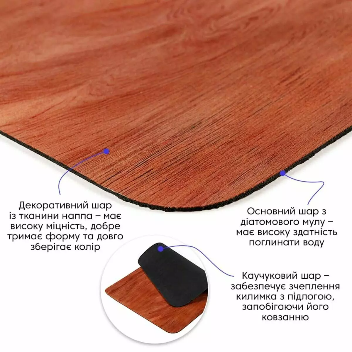 • Каучуковий шар – забезпечує зчеплення килимка із підлогою, запобігаючи його ковзанню на гладких або слизьких поверхнях.